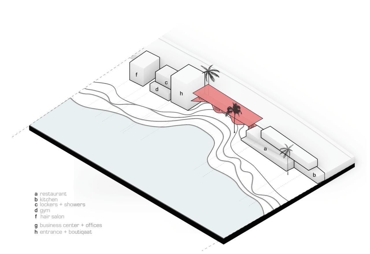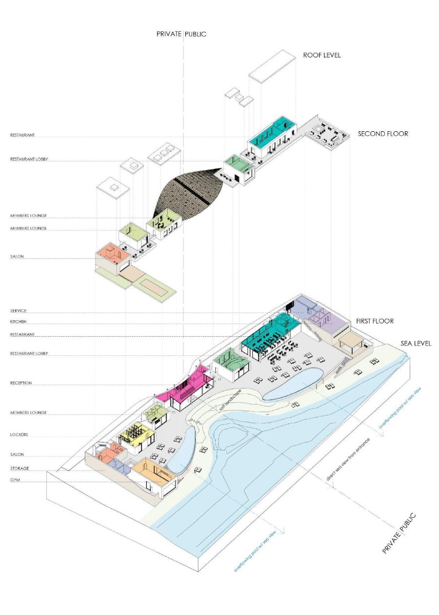 Clayered terraces and spaces on top of the minimal ground floor. Keeping the program and circulation intact while separating the forms through courtyards and pathways that give the place a natural feel. It's not busy, and the materials are meant to give a chilled-out vibe and cause the visitors to look out onto the scenery and enjoy nature.